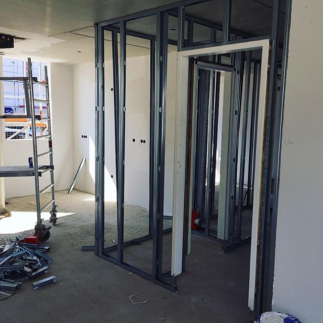 Beginn der Ausbauarbeiten im Baufeld 4. Die ersten Trockenbauwände werden aufgestellt.