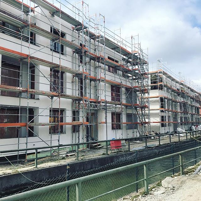 Fortschritt im Baufeld 4: Die Fenster sind eingebaut, die Fassade ist verputzt - für die Klinkerfassade ist alles vorbereitet.
