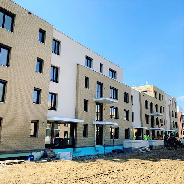 Fassadenarbeiten an der Ostseite des Baufeld 2.1 sind abgeschlossen. Es folgen die Arbeiten an den Außenanlagen.