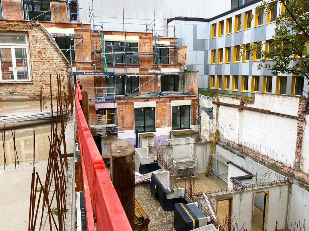 Blick von der Villa in die Ateliers und auf den Neubau.