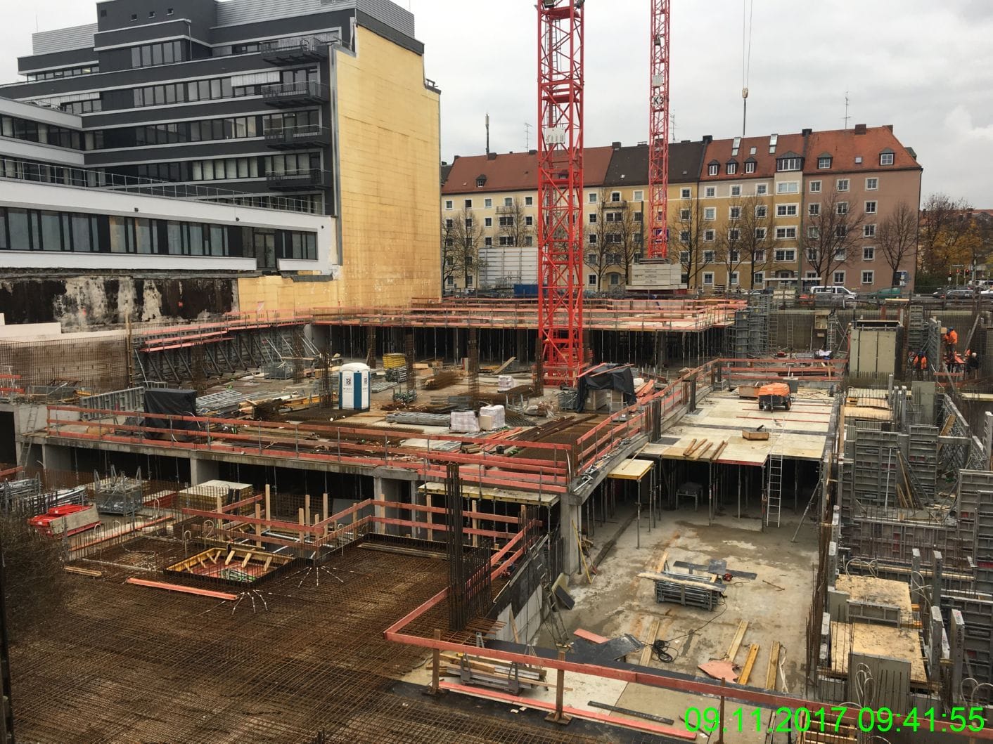 Der Rohbau wächst bis in die Erdgeschossebene. Die Geschosse UG1 sowie UG2 werden kaskadenförmig nachgeführt.