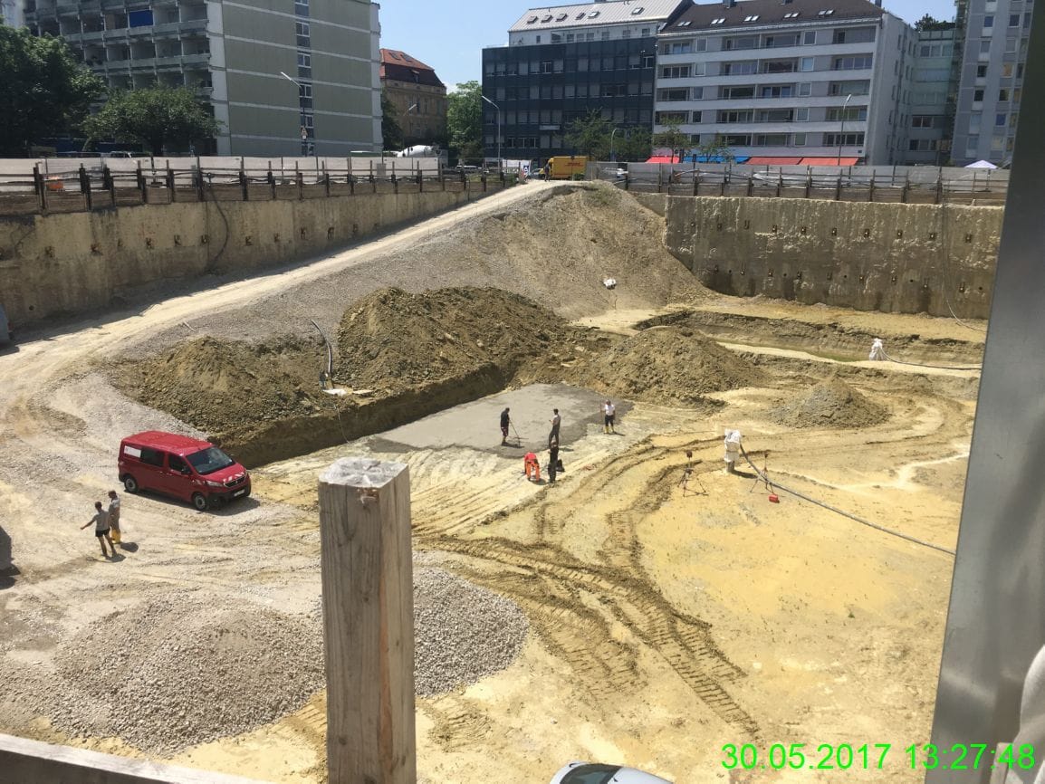 Nachdem die Verbauarbeiten und der Aushub der Baugrube abgeschlossen sind, beginnt die Rohbauphase mit den ersten Betonagearbeiten.